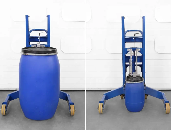 Le manipulateur de fûts DTP03-R500 est un appareil manuel conçu pour la manipulation précise et sécurisée de fûts industriels. Il permet de soulever et de déplacer des fûts en acier, plastique ou carton, incluant les modèles MAUSER, avec une capacité maximale de 350 kg. Grâce à ses pieds ajustés, il contourne facilement les palettes pour un déchargement ou un transport optimisé. Le levage est assuré par une pompe hydraulique actionnée manuellement, tandis qu’une vanne garantit un contrôle précis de la descente.