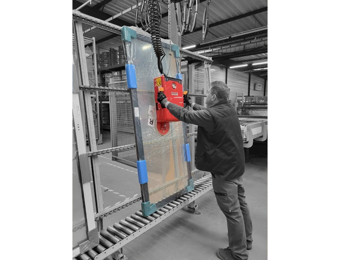 Le manipulateur ventouses compact rotation 360° ERGO VITRAGE GML 2 est une solution de manutention unique, spécialement conçue pour la manipulation rapide de pièces à surfaces planes en verre. Idéal pour les processus de manutention dans la production de verre et de fenêtres, cet appareil allie efficacité, ergonomie et simplicité d’utilisation. Sa conception intègre des poignées de chaque côté du cadre pour une prise en main confortable. Le mécanisme de levage continu permet une manipulation d’une seule main, avec tous les éléments de commande regroupés dans un corps compact pour une utilisation intuitive.
