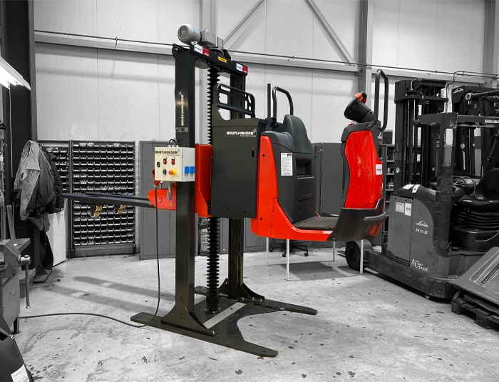 La mise en service est rapide et intuitive : en moins d’une minute, l’opérateur positionne les patins de support et les fourches, les fixe avec une vis de tension, puis élève l’engin à la hauteur souhaitée d’un simple clic. Compatible avec la plupart des chariots jusqu’à 2 500 kg, il permet d’atteindre une hauteur de levage maximale de 1 400 mm, offrant une position de travail confortable, même en position assise.
